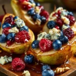 A stunning dessert featuring sweet baked pears filled with mixed berries, honey, walnuts, and blue cheese.