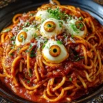 A fun and spooky dish perfect for Halloween gatherings, featuring spaghetti in a delicious ‘bloody’ sauce topped with mozzarella eyeballs.