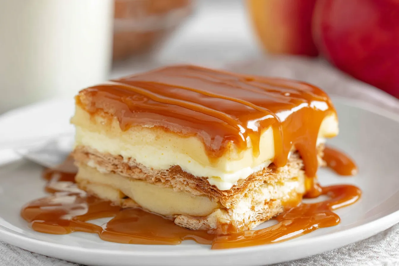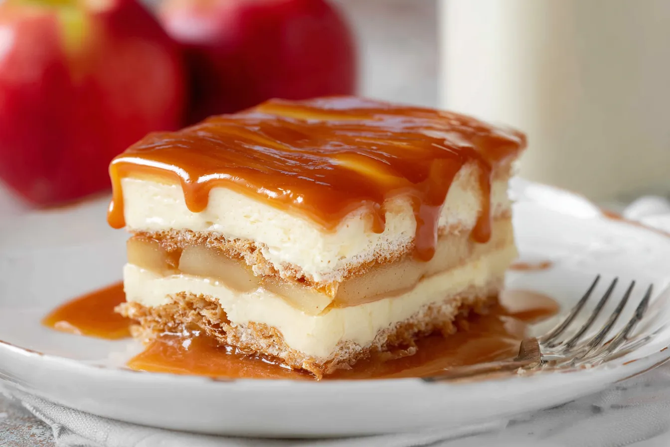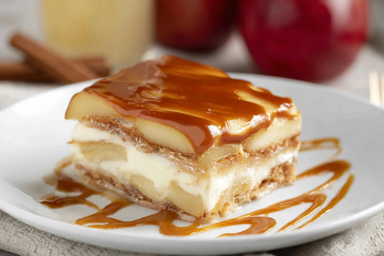 - Repeat the Layers: Add a second layer of eclairs, followed by the remaining cream mixture, apples, and top it off with the rest of the caramel sauce.