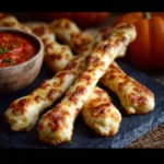 Spooky and fun cheesy breadsticks shaped like bones, perfect for Halloween gatherings and parties.